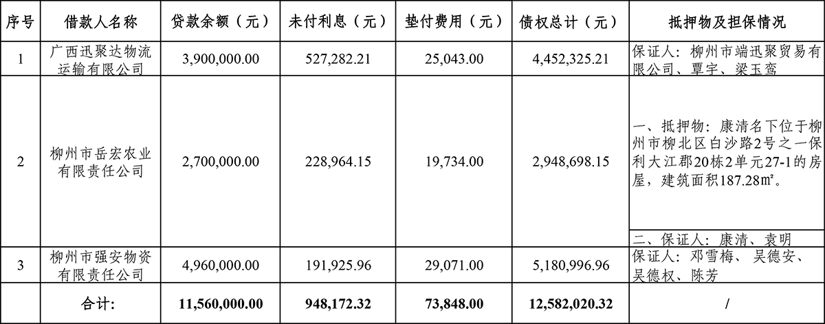 截至基准日2025年11月26日,标的债权合计3户,债权总金额为人民币壹仟贰佰伍拾捌万贰仟零贰拾元叁角贰分(小写:¥ 12,582,020.32),其中债权本金 11,560,000.00 元;利息948,172.32元;垫付费用73,848.00元。(最终以债务人、担保人等原已签署的贷款合同及生效法律文书等内容为准)。具体情况如下表: