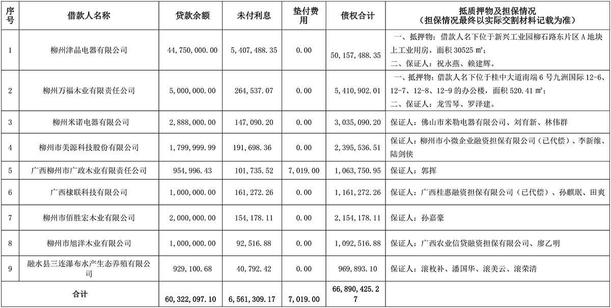 广西联合资产管理股份有限公司(以下简称“广西联合资管”)拟对其合法持有的柳州津晶电器有限公司等9户不良债权(以下简称“标的债权”)进行公开转让处置,现予以公告。