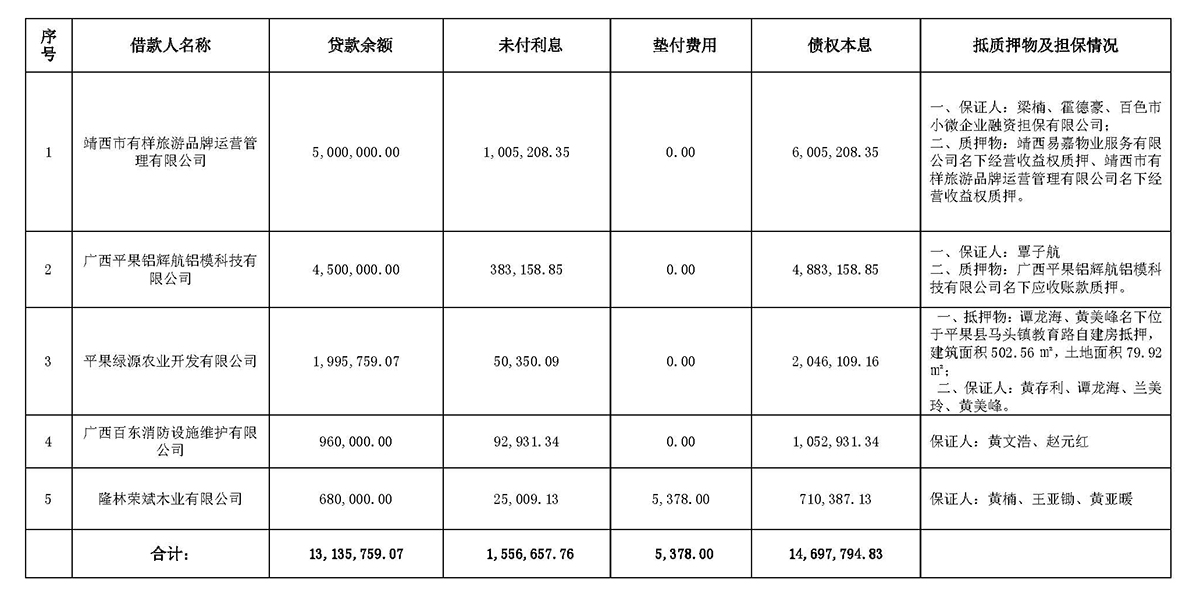 广西联合资产管理股份有限公司(以下简称“广西联合资管”)拟对其合法持有的靖西市有样旅游品牌运营管理有限公司等5户不良债权(以下简称“标的债权”)进行公开转让处置,现予以公告。